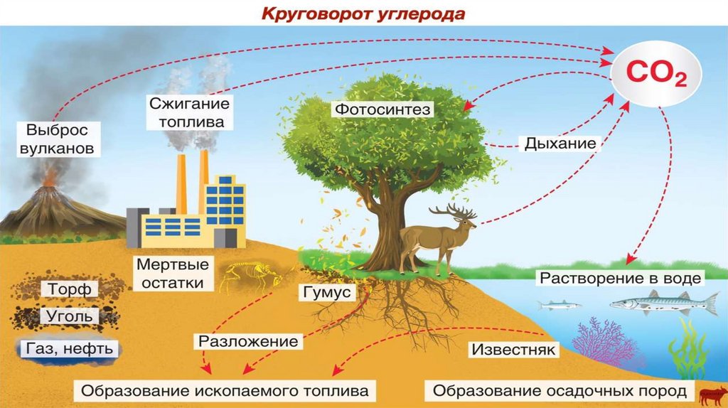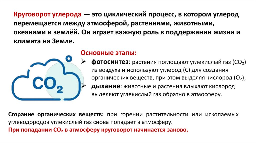 Круговорот углерода — это циклический процесс, в котором углеродперемещается между атмосферой, растениями, животными,