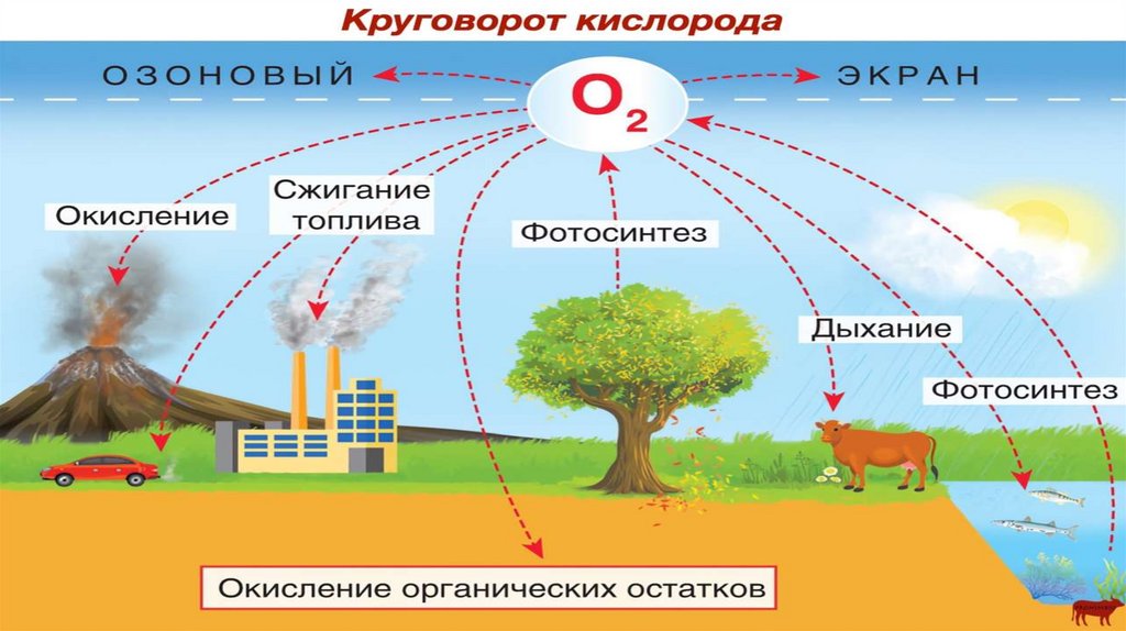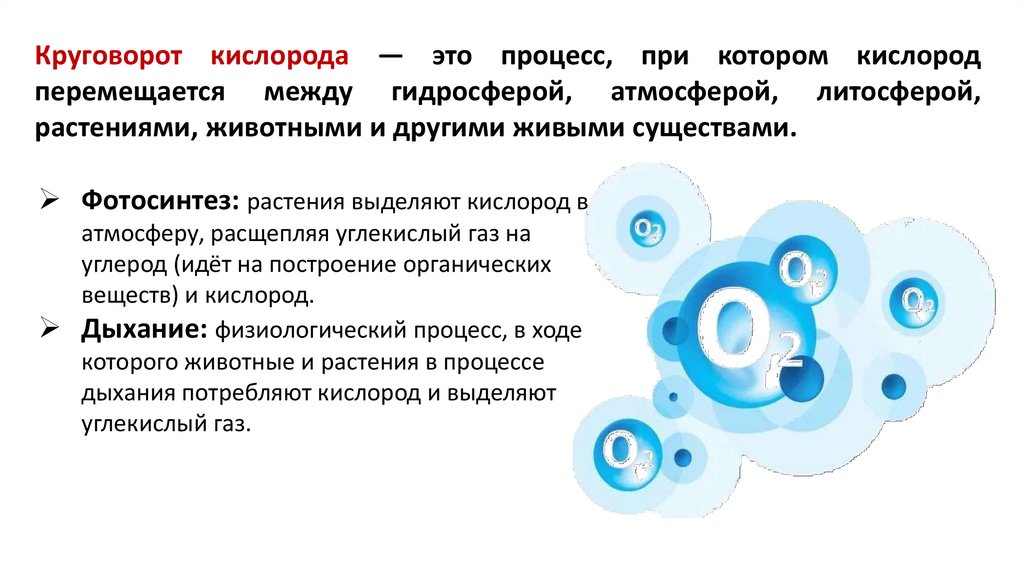 Круговорот кислорода — это процесс, при котором кислородперемещается между гидросферой, атмосферой, литосферой,