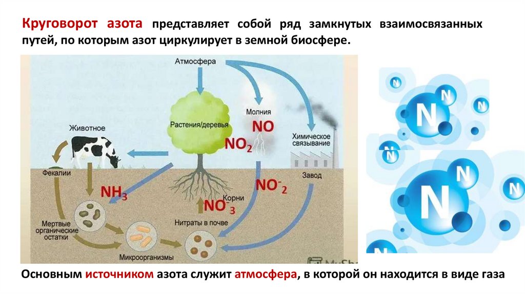Круговорот азота представляет собой ряд замкнутых взаимосвязанныхпутей, по которым азот циркулирует в земной биосфере.