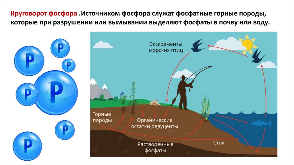 Круговорот фосфора .Источником фосфора служат фосфатные горные породы,которые при разрушении или вымывании выделяют фосфаты в почву или воду.