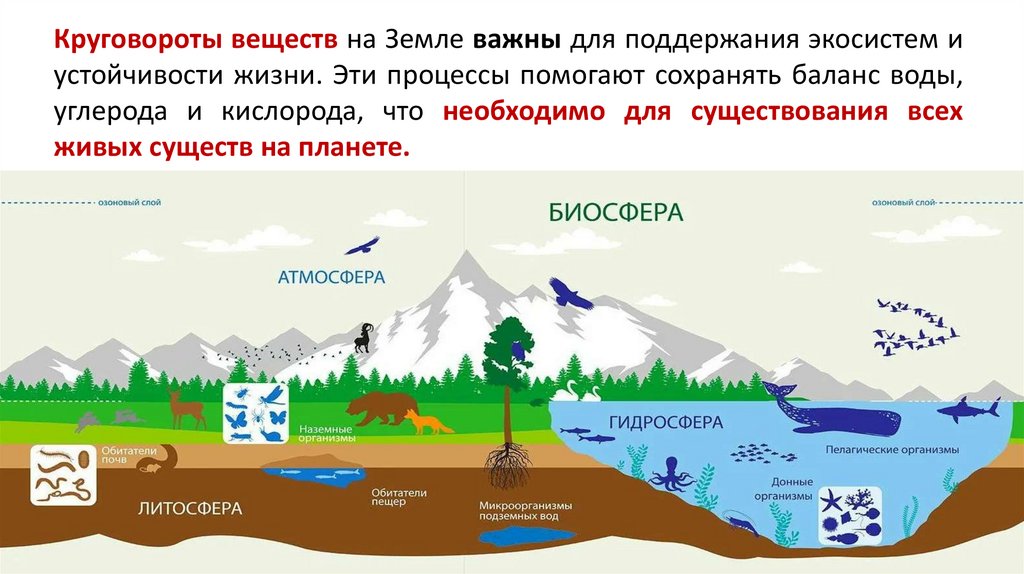 Круговороты веществ на Земле важны для поддержания экосистем иустойчивости жизни. Эти процессы помогают сохранять баланс воды,