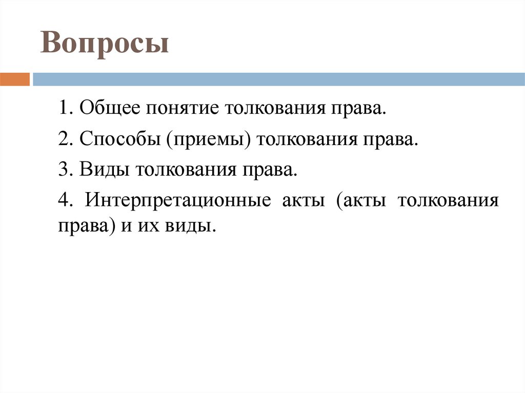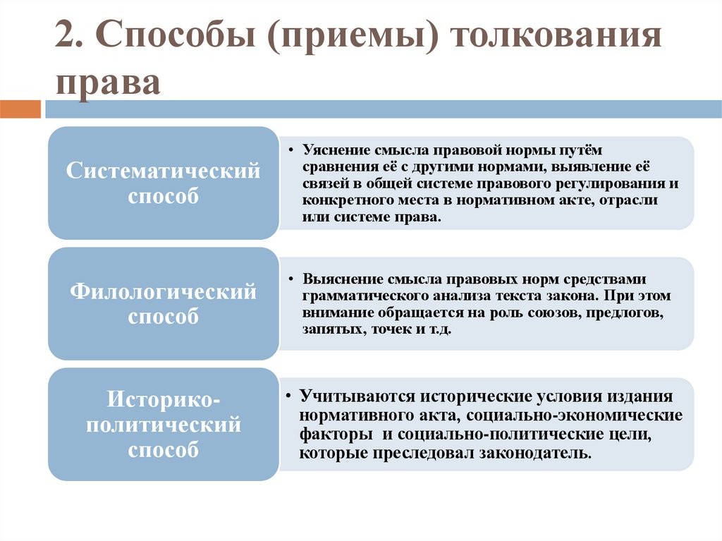 1. Общее понятие толкования права.2. Способы (приемы) толкования права.