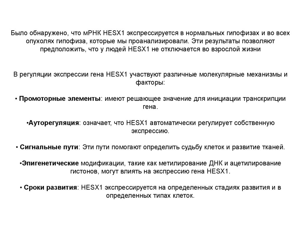 Было обнаружено, что мРНК HESX1 экспрессируется в нормальных гипофизах и во всехопухолях гипофиза, которые мы проанализировали. Эти результаты позволяют