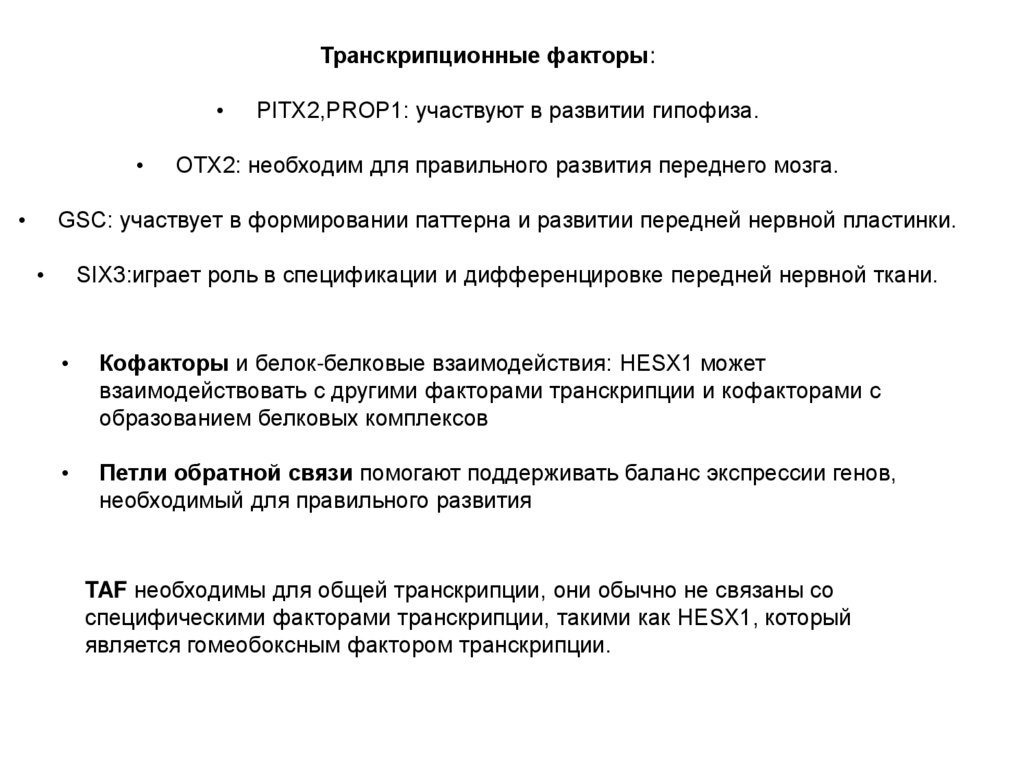 Транскрипционные факторы:PITX2,PROP1: участвуют в развитии гипофиза.