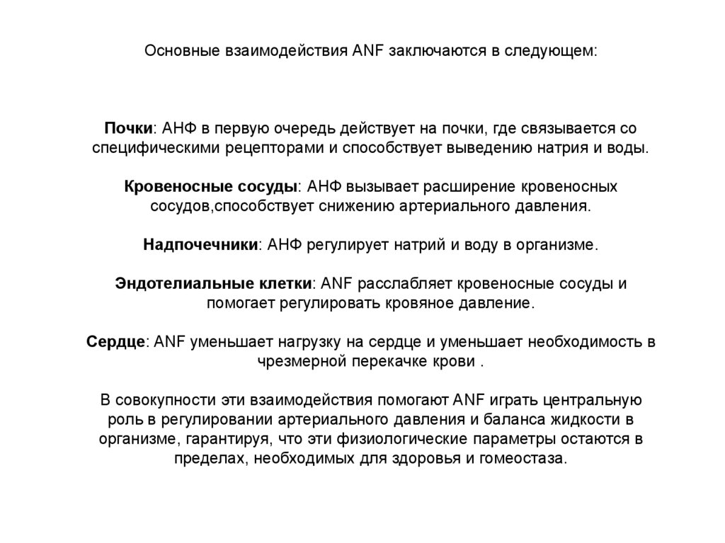 Oсновные взаимодействия ANF заключаются в следующем:Почки: АНФ в первую очередь действует на почки, где связывается со