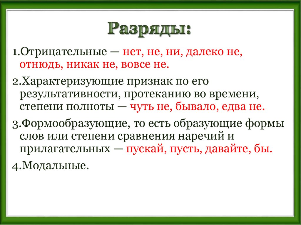 1.Отрицательные — нет, не, ни, далеко не,отнюдь, никак не, вовсе не.