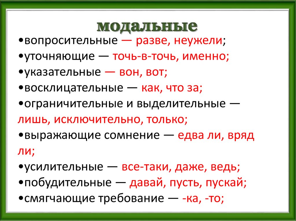 •вопросительные — разве, неужели;•уточняющие — точь-в-точь, именно;