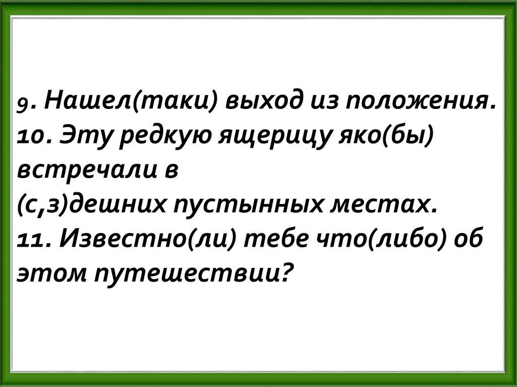 9. Нашел(таки) выход из положения.10. Эту редкую ящерицу яко(бы)