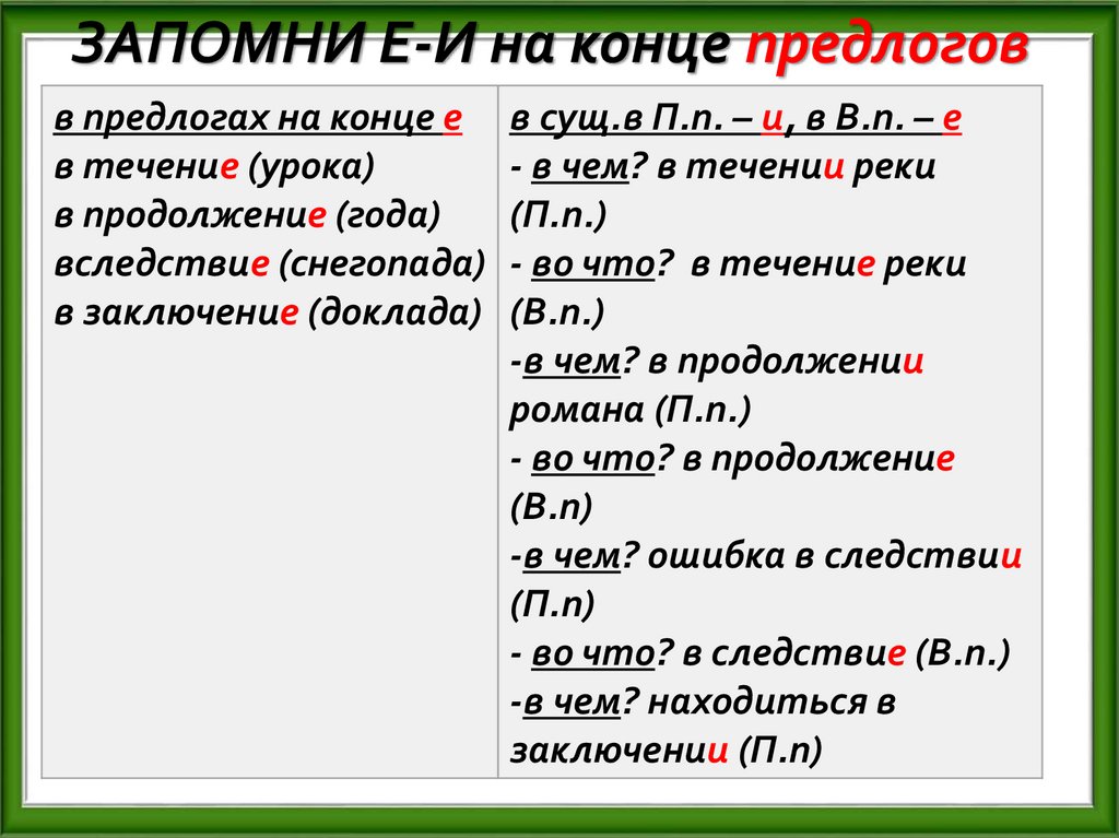 ЗАПОМНИ Е-И на конце предлоговв предлогах на конце е в сущ.в П.п. – и, в В.п. – е
