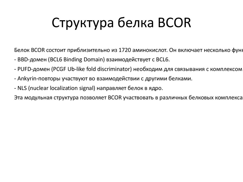 Эта модульная структура позволяет BCOR участвовать в различных белковых комплексах