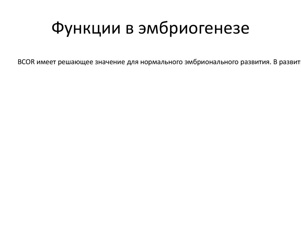 Функции в эмбриогенезеBCOR имеет решающее значение для нормального эмбрионального развития. В развити