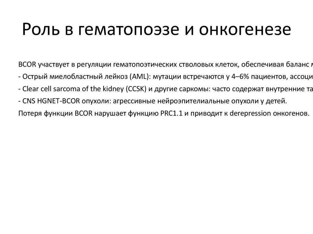 Роль в гематопоэзе и онкогенезеBCOR участвует в регуляции гематопоэтических стволовых клеток, обеспечивая баланс м
