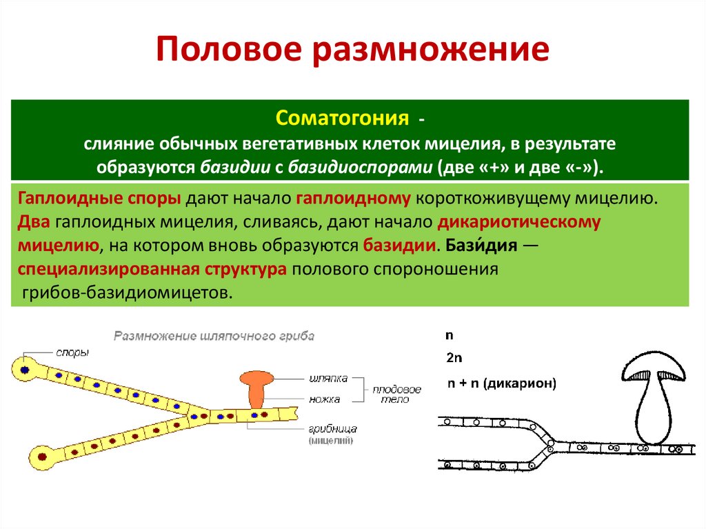 Соматогония слияние обычных вегетативных клеток мицелия, в результатеобразуются базидии с базидиоспорами (две «+» и две «-»).