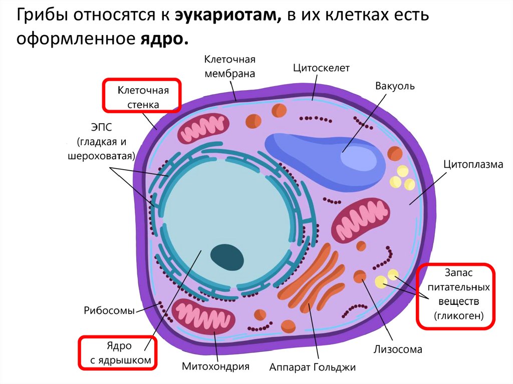Грибы относятся к эукариотам, в их клетках естьоформленное ядро.