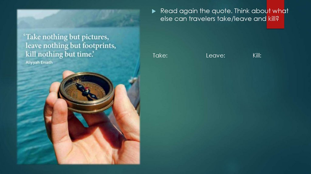 Read again the quote. Think about whatelse can travelers take/leave and kill?