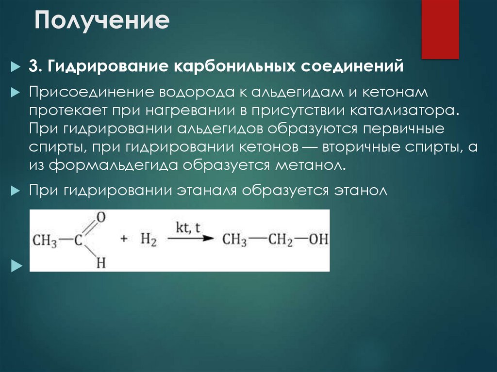3. Гидрирование карбонильных соединенийПрисоединение водорода к альдегидам и кетонам
