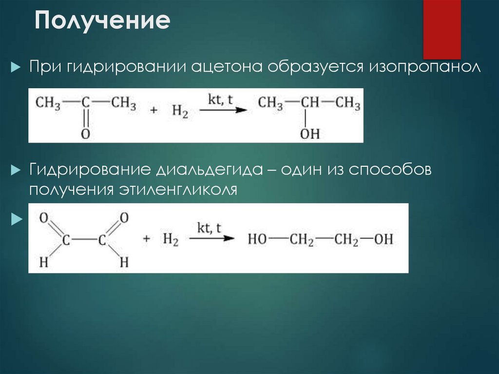 При гидрировании ацетона образуется изопропанолГидрирование диальдегида – один из способов