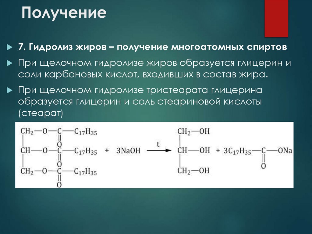 7. Гидролиз жиров – получение многоатомных спиртовПри щелочном гидролизе жиров образуется глицерин и
