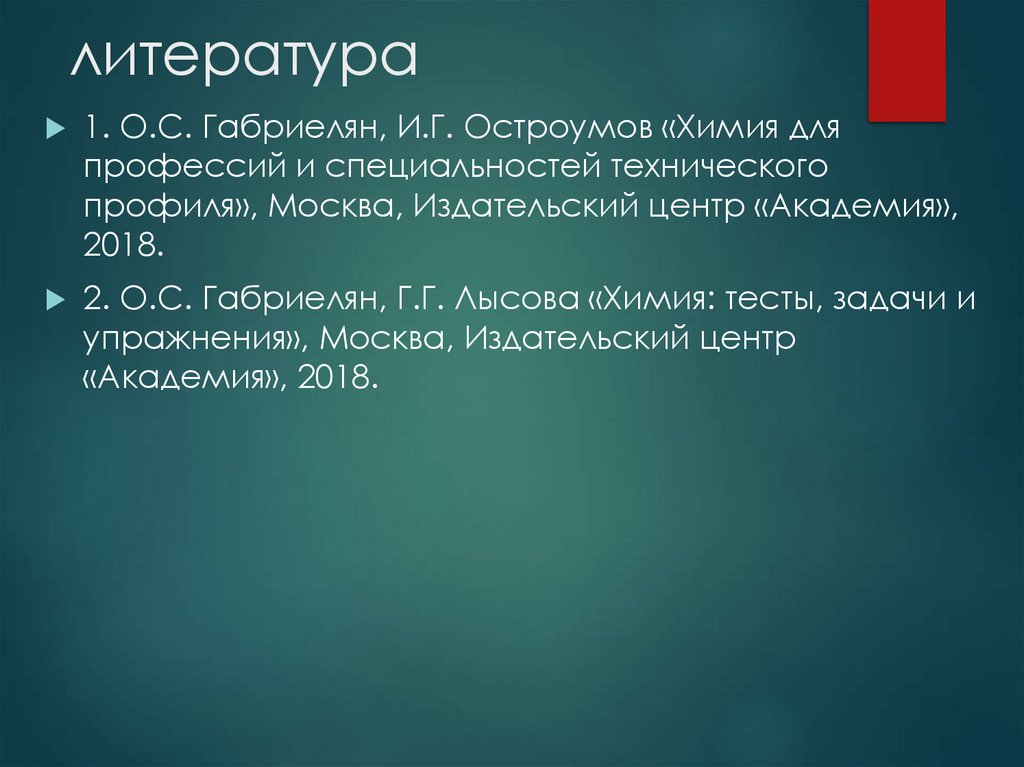 1. О.С. Габриелян, И.Г. Остроумов «Химия дляпрофессий и специальностей технического