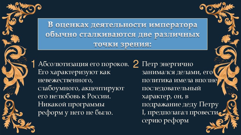 Абсолютизация его пороков. 2 Петр энергичноЕго характеризуют как