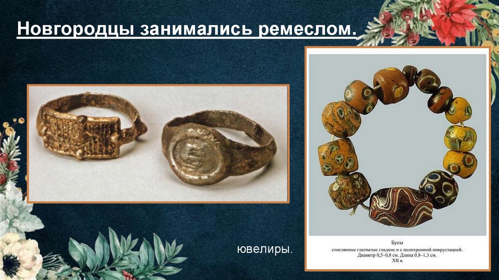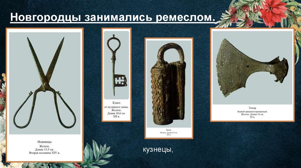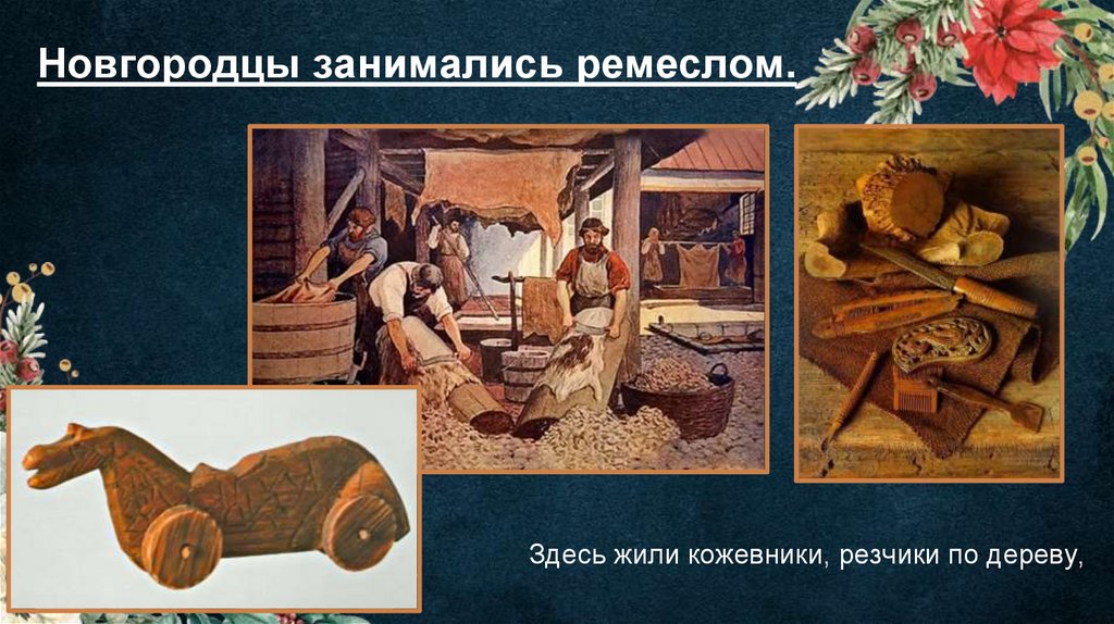 Новгородцы занимались ремеслом.Здесь жили кожевники, резчики по дереву,