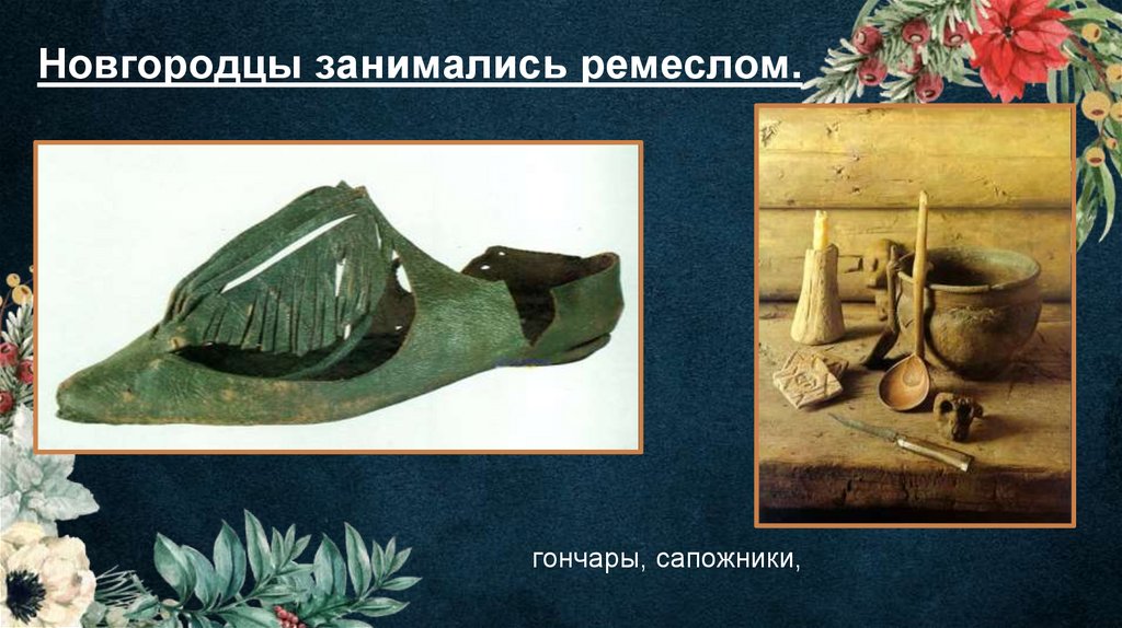 Новгородцы занимались ремеслом.гончары, сапожники,