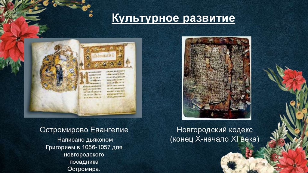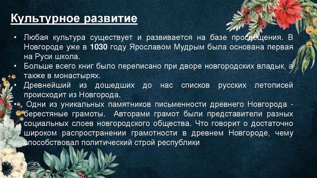 Культурное развитие• Любая культура существует и развивается на базе просвещения. В