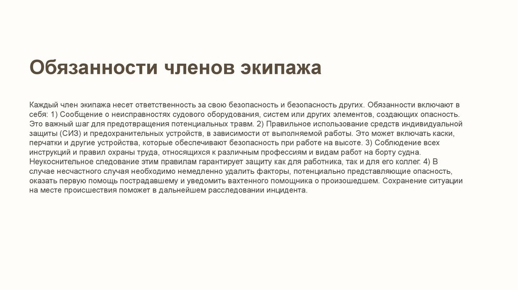 Обязанности членов экипажаКаждый член экипажа несет ответственность за свою безопасность и безопасность других. Обязанности включают в