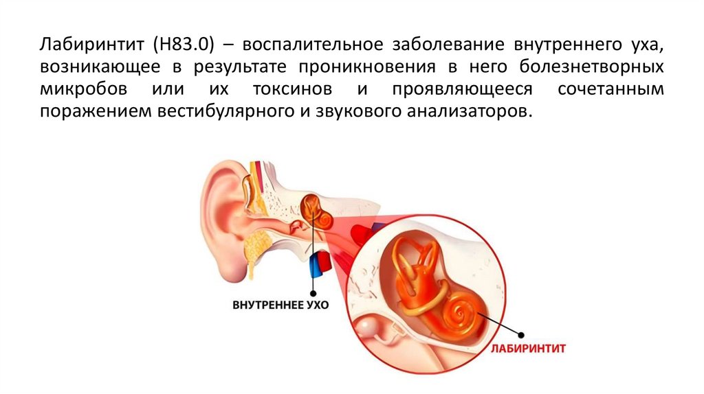 Лабиринтит (Н83.0) – воспалительное заболевание внутреннего уха,возникающее в результате проникновения в него болезнетворных