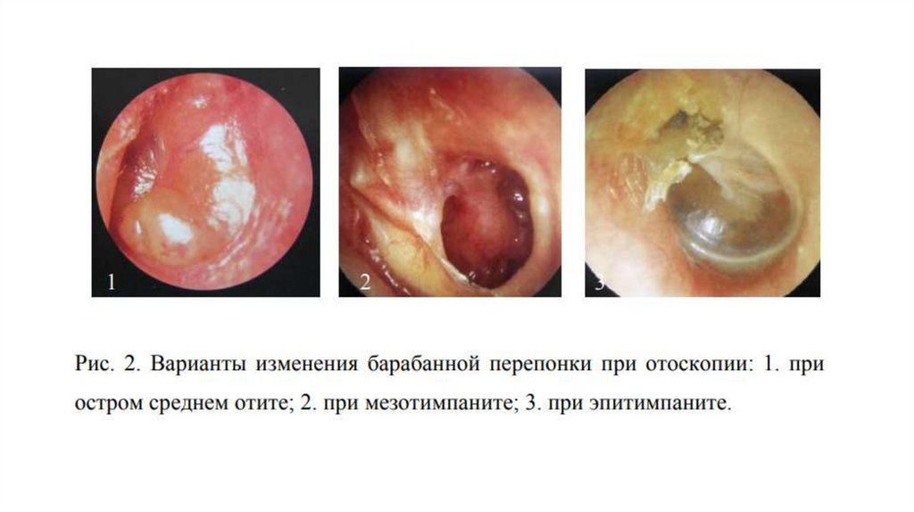 • Признаки среднего отита (гиперемия, выпячивание барабанной перепонки, перфорация,
