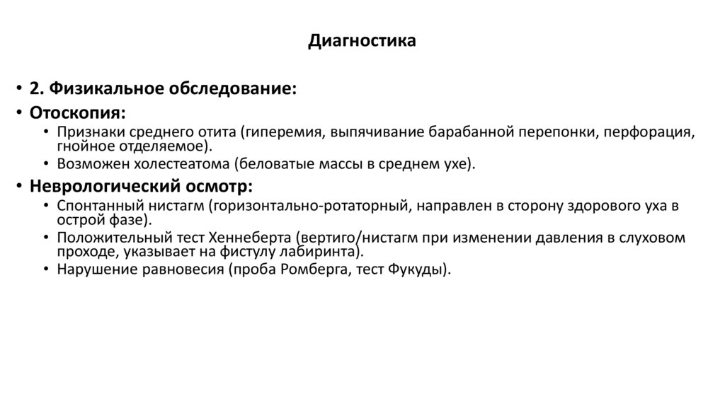 • Положительный тест Хеннеберта (вертиго/нистагм при изменении давления в слуховом