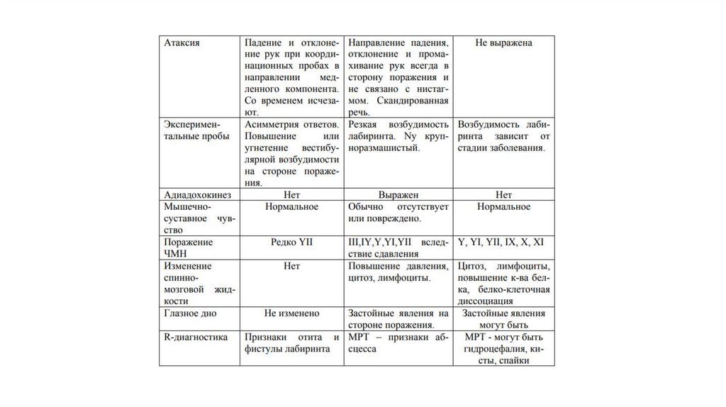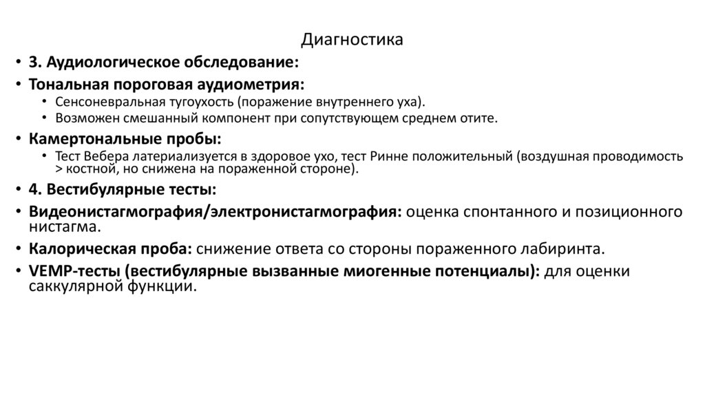 • Калорическая проба: снижение ответа со стороны пораженного лабиринта.