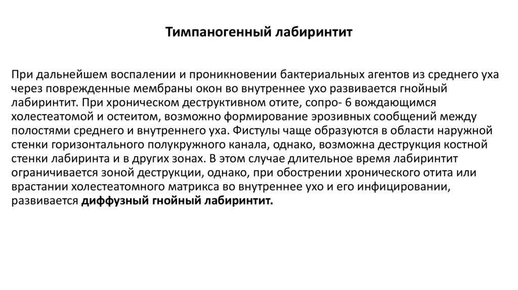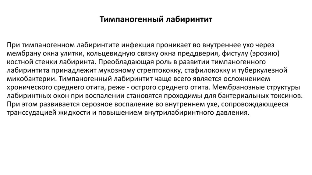 Тимпаногенный лабиринтитПри тимпаногенном лабиринтите инфекция проникает во внутреннее ухо через