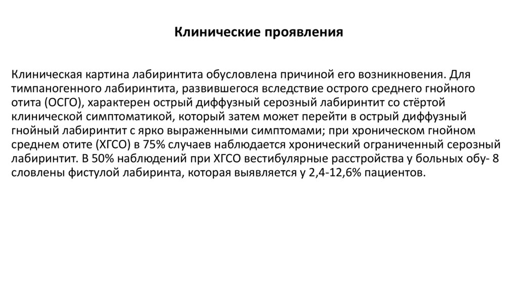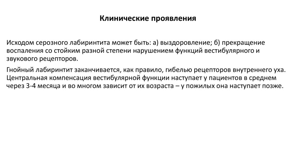 Клинические проявленияИсходом серозного лабиринтита может быть: а) выздоровление; б) прекращение