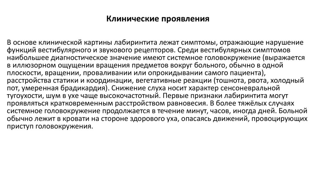Клинические проявленияКлиническая картина лабиринтита обусловлена причиной его возникновения. Для
