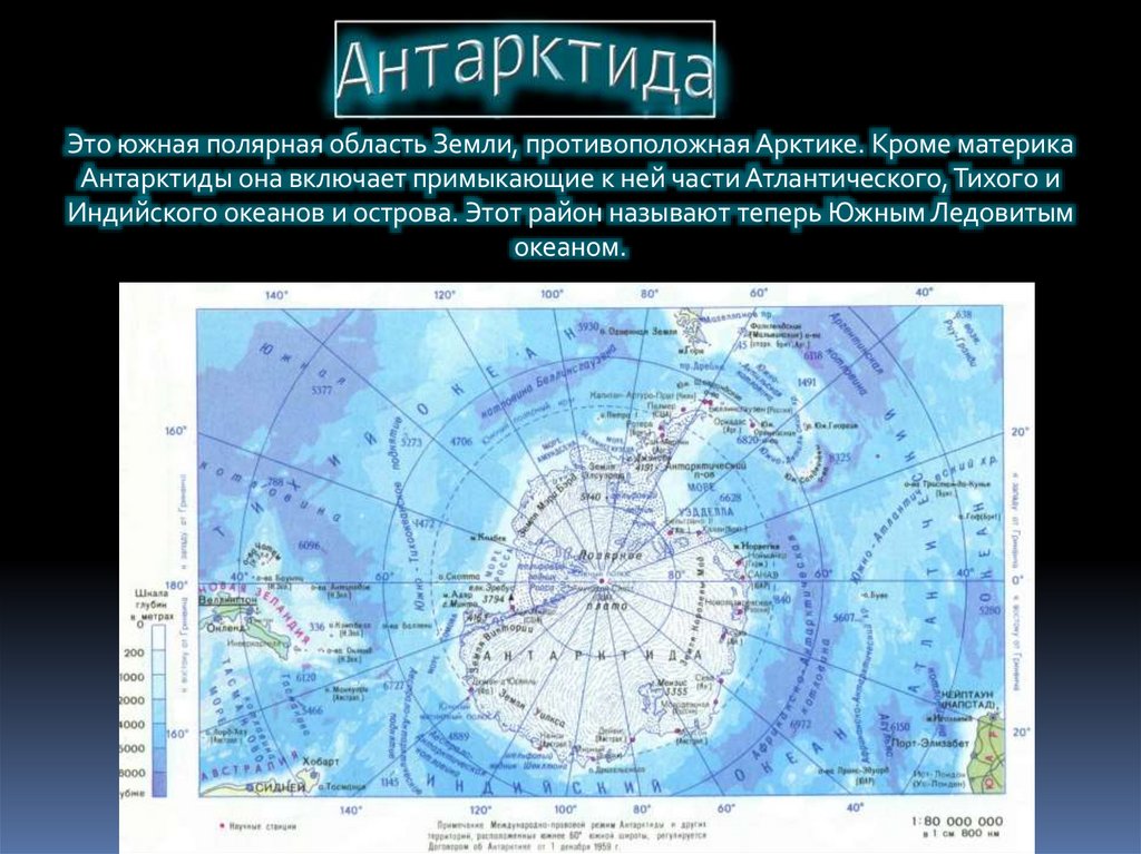 Это южная полярная область Земли, противоположная Арктике. Кроме материкаАнтарктиды она включает примыкающие к ней части Атлантического, Тихого и