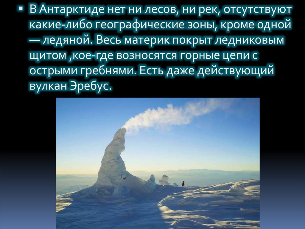 В Антарктиде нет ни лесов, ни рек, отсутствуюткакие-либо географические зоны, кроме одной