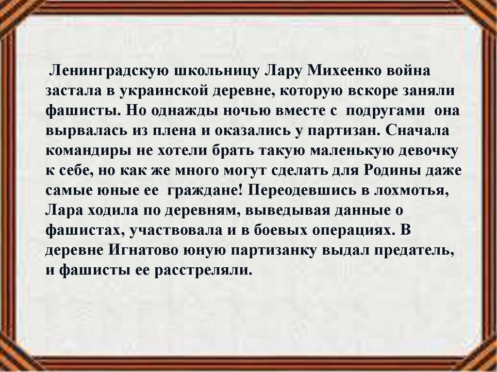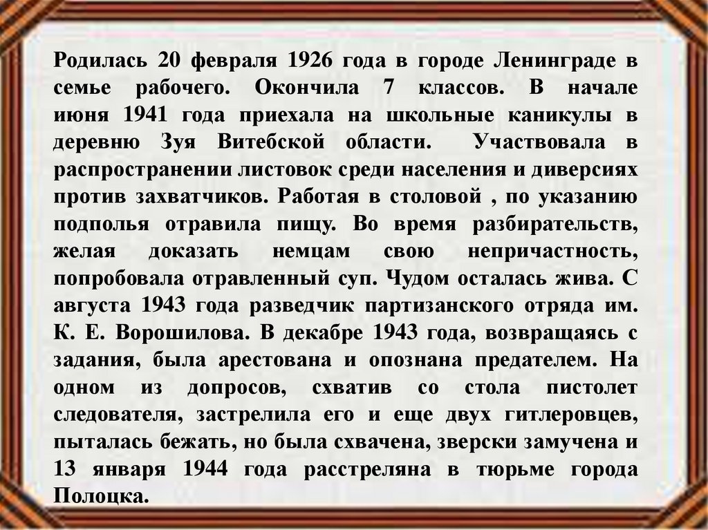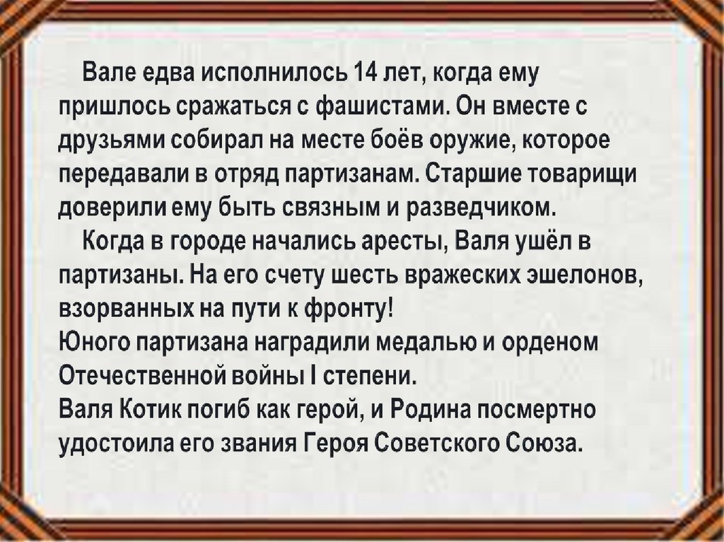 7. Вместе с сестрой Адой ушел в партизаны, где стал разведчиком. Проникал во вражеские гарнизоны и доставлял командованию ценные
