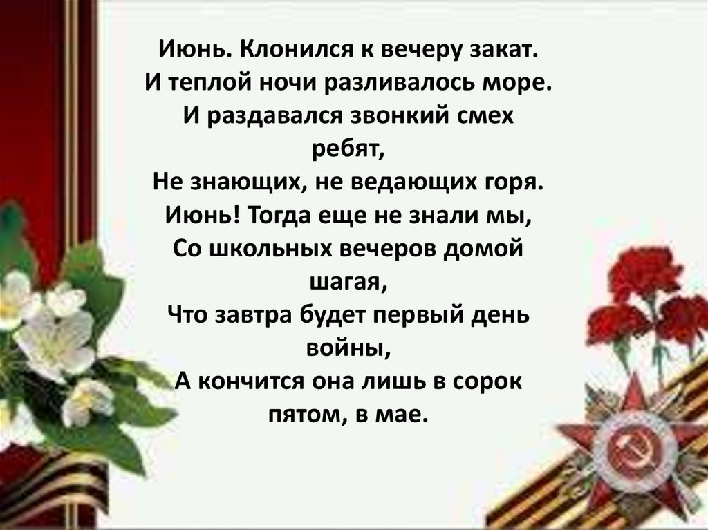 Июнь! Тогда еще не знали мы,Со школьных вечеров домой