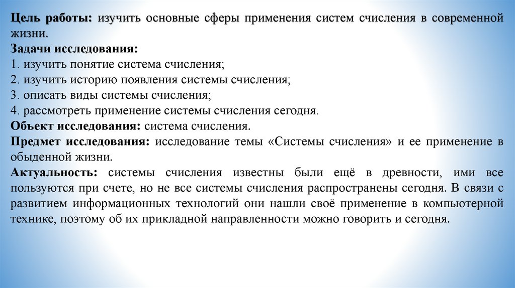 Предмет исследования: исследование темы «Системы счисления» и ее применение в