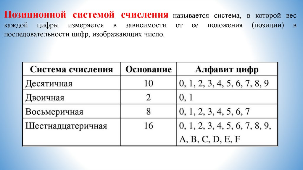 Позиционной системой счисления называется система, в которой вескаждой цифры измеряется в зависимости