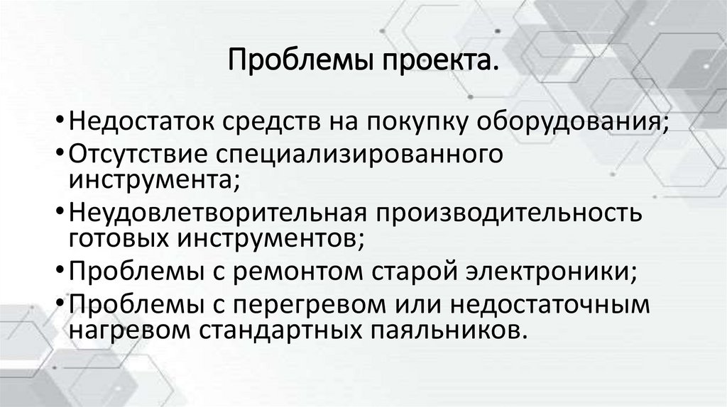 Проблемы проекта.• Недостаток средств на покупку оборудования;