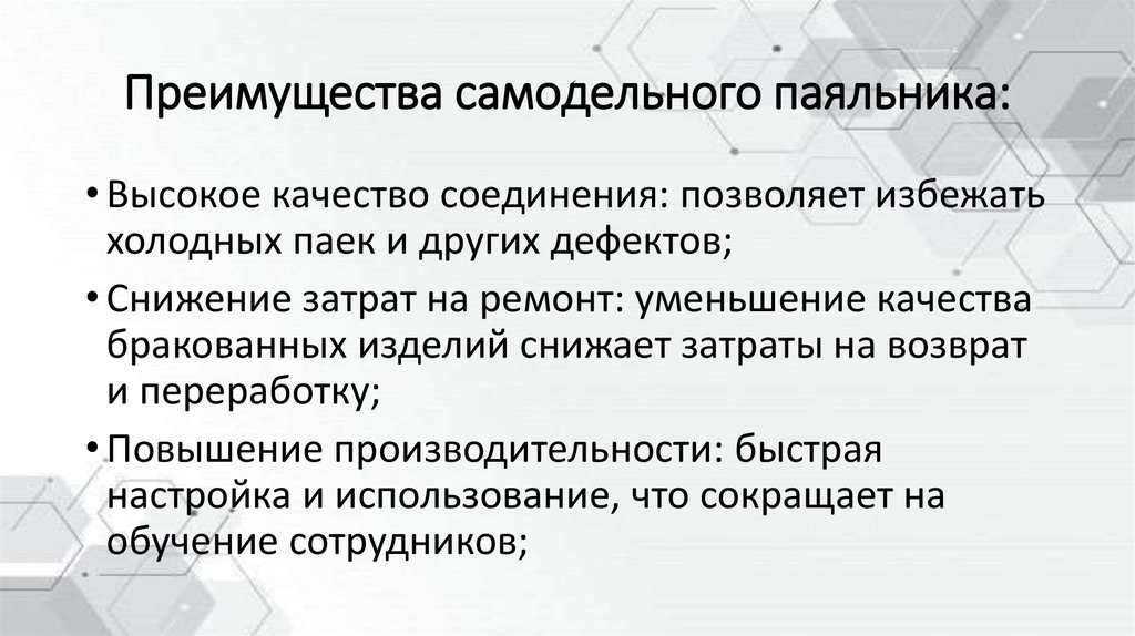 Преимущества самодельного паяльника:• Высокое качество соединения: позволяет избежать
