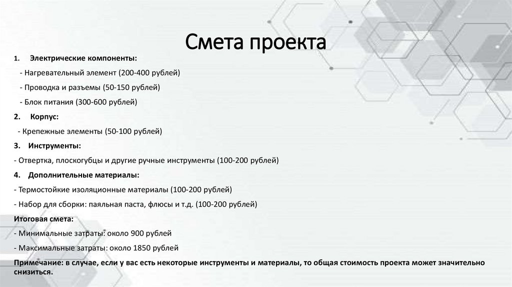 Примечание: в случае, если у вас есть некоторые инструменты и материалы, то общая стоимость проекта может значительно