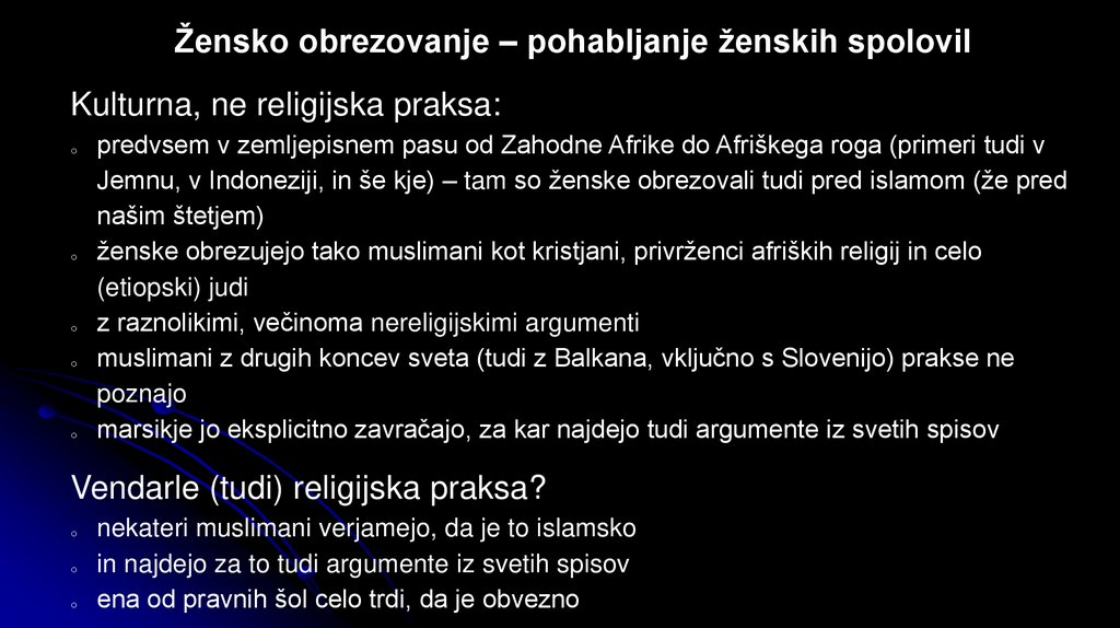 Žensko obrezovanje – pohabljanje ženskih spolovilKulturna, ne religijska praksa:
