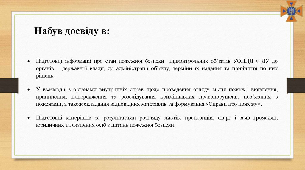 Набув досвіду в:Підготовці інформації про стан пожежної безпеки підконтрольних об’єктів УОППД у ДУ до
