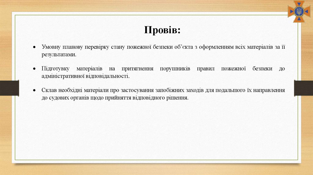Провів:Умовну планову перевірку стану пожежної безпеки об’єкта з оформленням всіх матеріалів за її