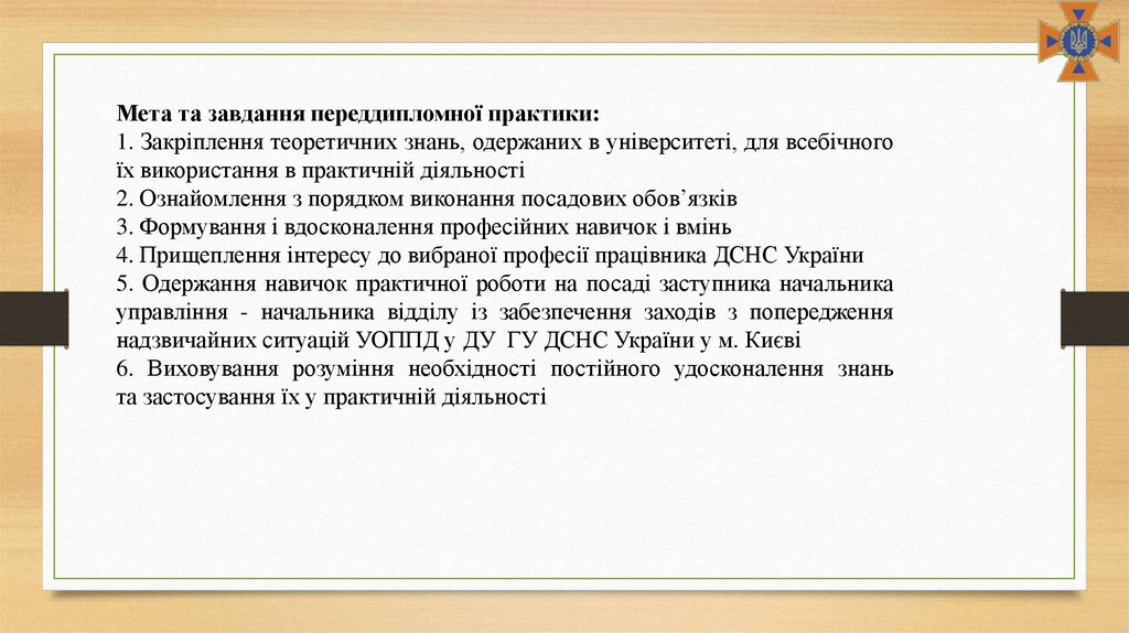 5. Одержання навичок практичної роботи на посаді заступника начальника