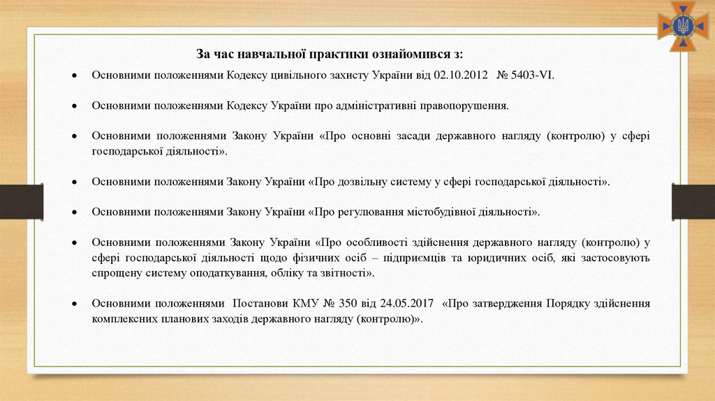 За час навчальної практики ознайомився з:Основними положеннями Кодексу цивільного захисту України від 02.10.2012 № 5403-VI.