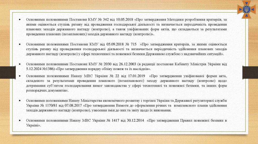 Основними положеннями Постанови КМУ № 342 від 10.05.2018 «Про затвердження Методики розроблення критеріїв, заякими оцінюється ступінь ризику від провадження господарської діяльності та визначається періодичність проведення